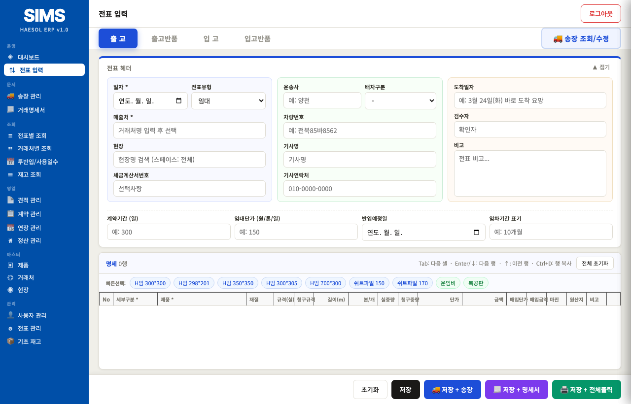 전표 입력 — 출고/반품/입고 통합. 빠른선택으로 자재 즉시 추가