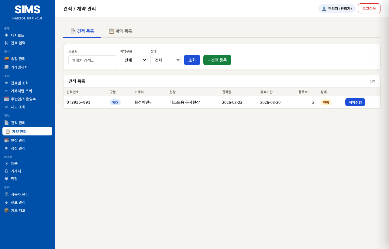 견적 · 계약 관리 — 견적 발행 → 계약전환 → 임대 라이프사이클 추적