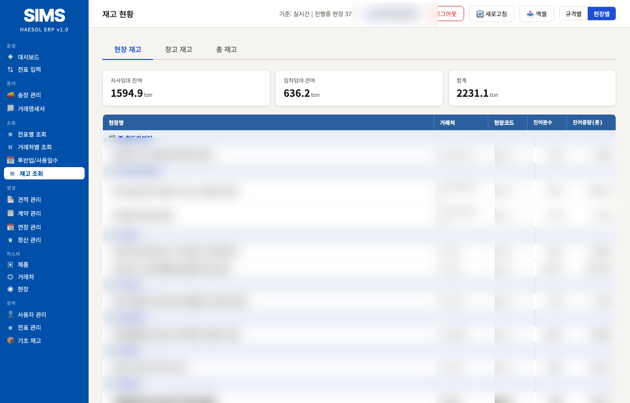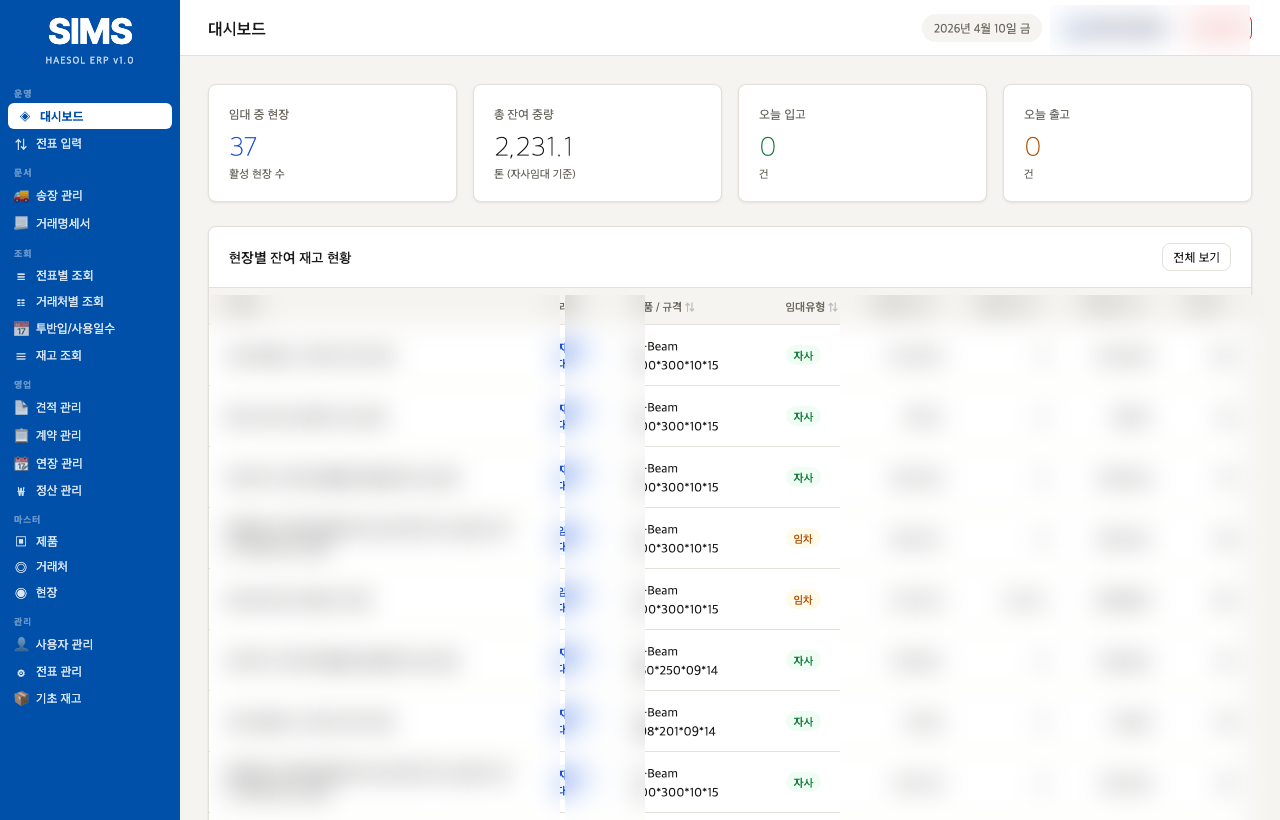 SIMS는 철강 임대업에 최적화된 전문 표준화 시스템 구축을 목적으로 2024년부터 사내에서 직접 개발·운영하고 있는 자체 ERP입니다. 본수·길이·중량 등 다중 단위 지표가 동시에 관리되어야 하는 업종의 특수성과, 자사재와 임차재가 한 현장에서 혼재되는 운영 환경을 반영하여 설계되었습니다.